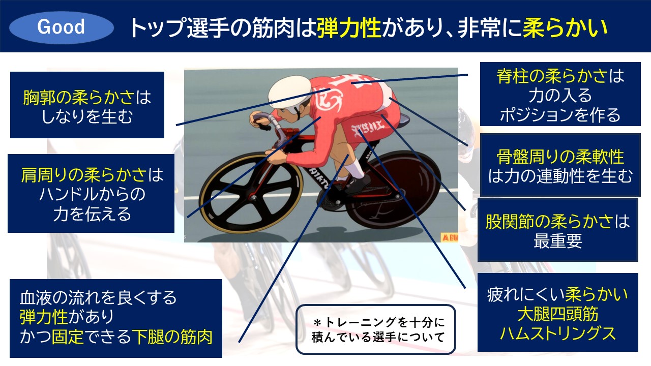 体幹、腰から骨盤の損傷や痛みや下肢のアライメント不良も強い筋力発揮を抑制してしまいます。腰の痛みや膝の痛みが発生し、骨盤がぶれたり低い姿勢が困難になるなど、ペダリングに問題を生じます。