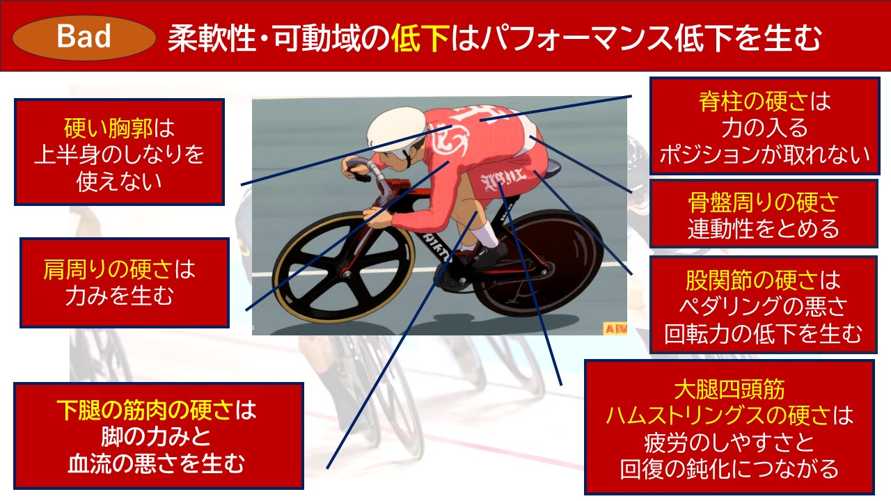 落車後の体のダメージがあることで、大幅な可動域の低下や、筋肉の収縮能力の低下、疲労回復能力の低下につながっていきます。